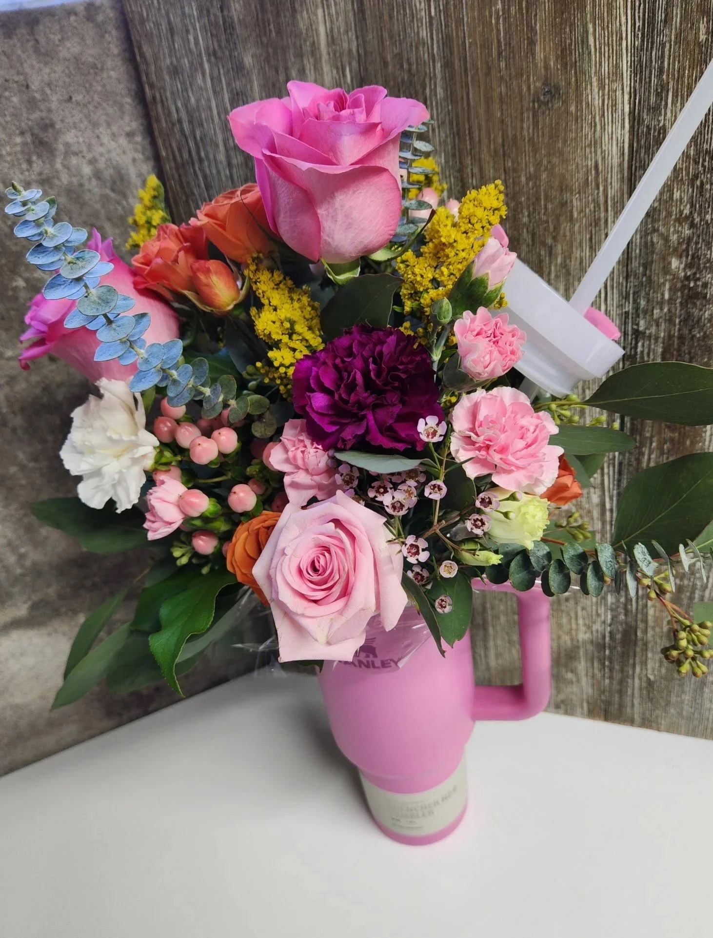 Stanley cup arrangements are a floral arrangement built inside a Stanley travel mug. These come in 30 oz ($80) and 40 oz ($90) versions.
